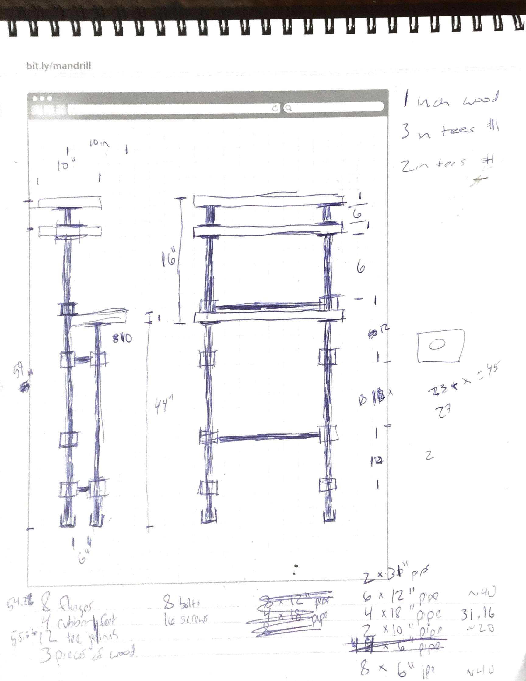 Before I went and purchased my initial materials, I sketched a quick plan for how the desk fit together in my awesome Mandrill UI Sketchbook. The final design ends up being a bit different.